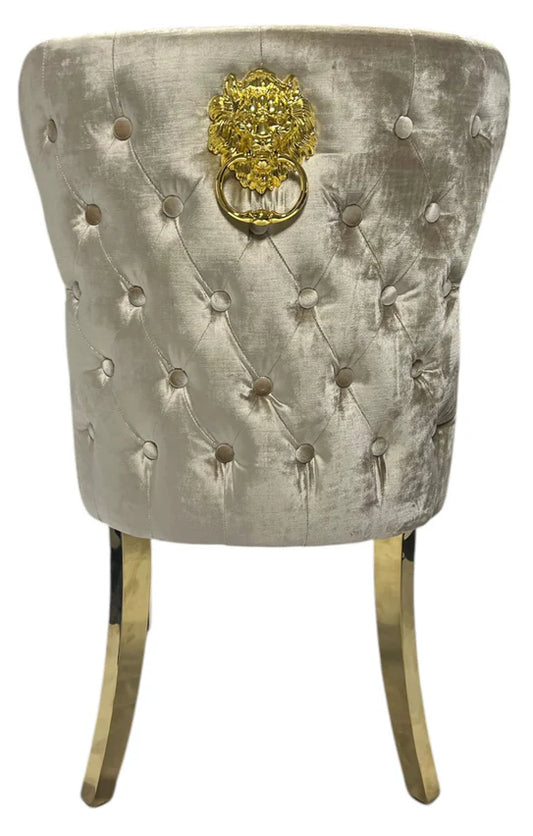 2 Mink Velvet Dining Chairs with Gold Leg & Lion Knocker