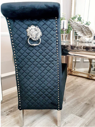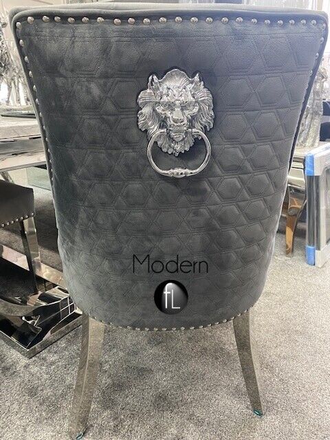 2 Grey velvet dining chairs with chrome legs & lion knocker