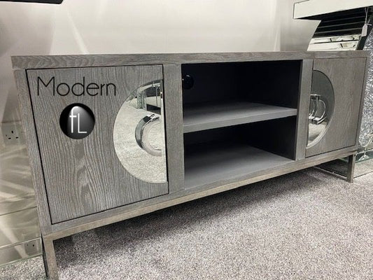 2 Door Grey Washed Wood TV unit with mirrored Circle
