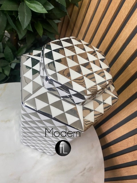 Large Ginger Jar Urn Silver & White Abstract Pattern Home Decor