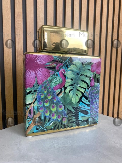 Large Ginger jar green and pink palm leaves Peacock Pattern decor 25cm high