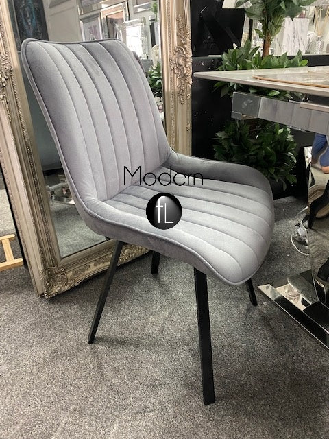 2x Grey velvet dining chairs with chrome leg