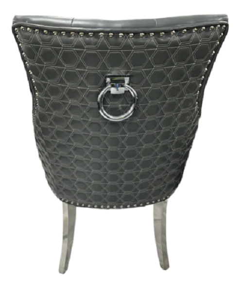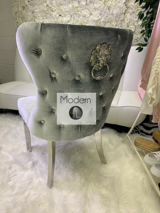 2x Silver Grey Velvet luxury dining chair with stud button back and lion knocker