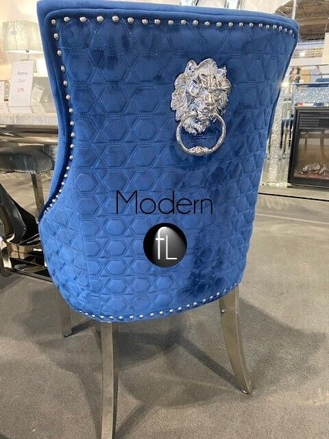 Blue velvet x2 dining chairs with chrome legs & lion knocker