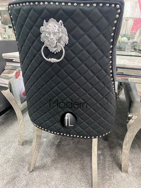 2x Luxury Black Velvet Dining Chairs with Chrome Lion Head Door Knocker and Legs