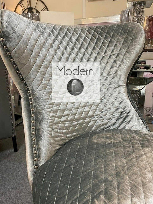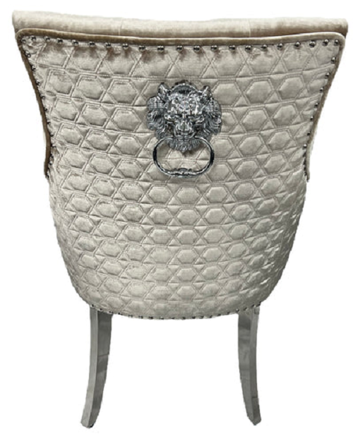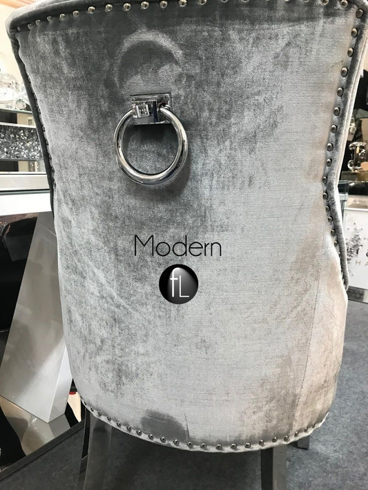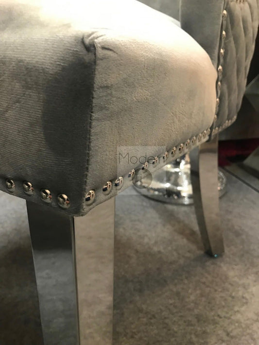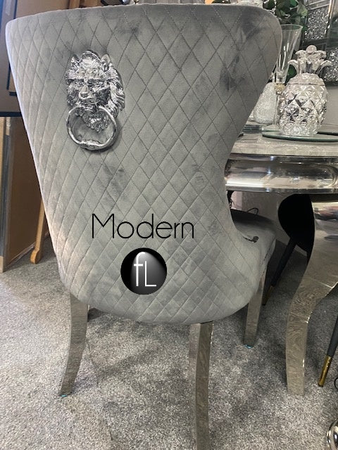 2x Silver Grey Velvet luxury dining chair with stud button back and lion knocker