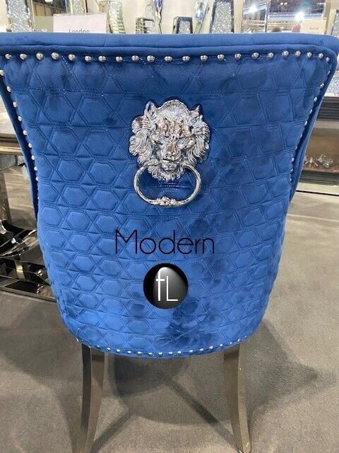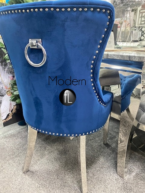 Blue velvet x2 dining chairs with chrome legs & lion knocker
