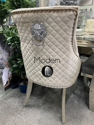 2 Shiny Mink velvet dining chairs with chrome legs & lion knocker