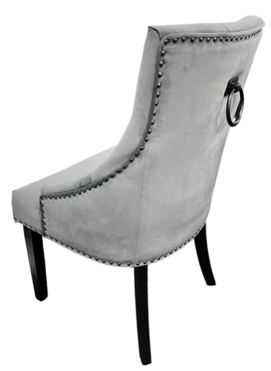 2x grey velvet dining chairs with pull handle Door knocker & black wooden legs
