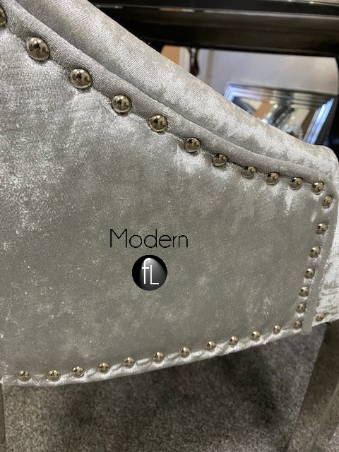 x1 Silver Crushed velvet dining chair with chrome leg & lion knocker Back