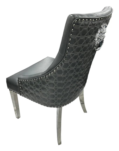 Dark Grey x2 faux leather dining chairs with chrome legs & lion knocker