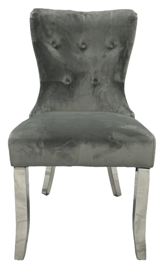 Grey Velvet Dining Chair with STud Button & Chrome Leg