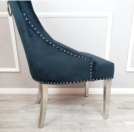 Black velvet x2 dining chairs with chrome legs & lion knocker