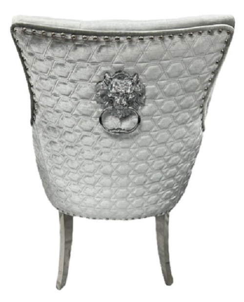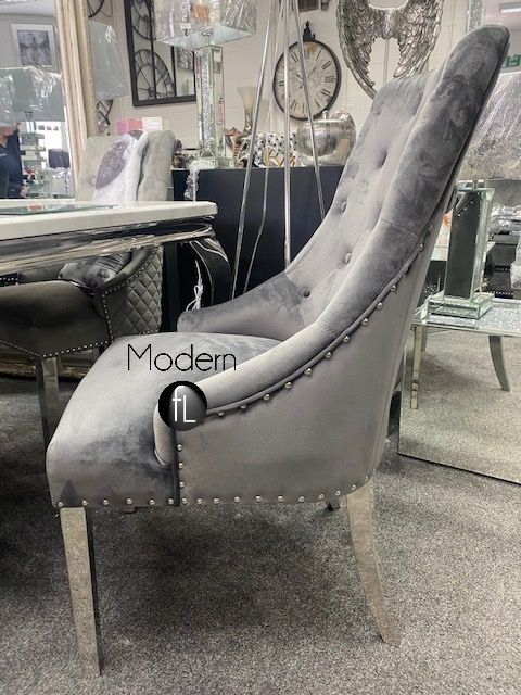 2 Silver Grey velvet dining chairs with chrome legs & lion knocker