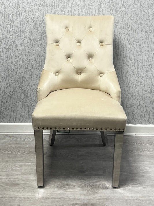 Luxury Pair Of Mink Velvet Dining Chairs with chrome leg and door knocker