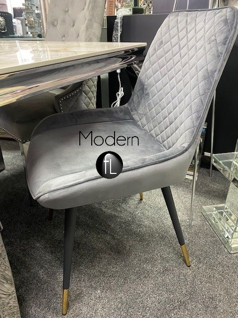 2x grey velvet dining chairs with pull handle Door knocker and chrome leg