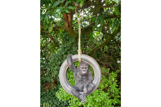 Hanging Gorilla on Tyre Swing Garden ornament, Gorilla outdoor swinging