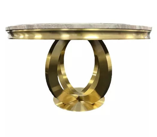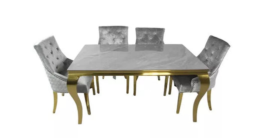 Gold Dining Table Grey Ceramic Stone Top 4 Silver Grey Lion Chairs Gold Legs