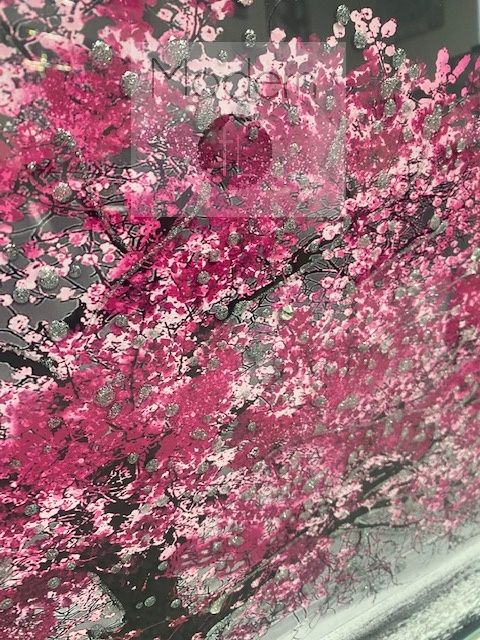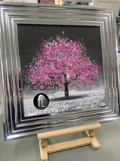 Small pink blossom tree picture in silver wood frame, pink glitter art picture