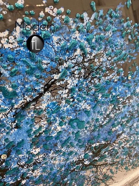 Blue blossom tree 3D glitter art picture in mirrored frame