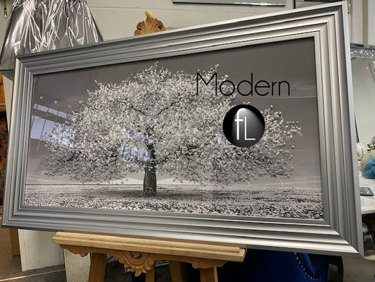 Stunning silver blossom tree 3D glitter art picture in a silver matte frame
