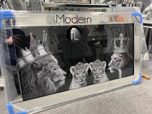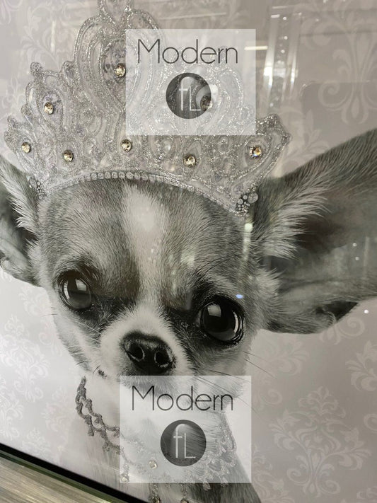 Silver grey chihuahua with crown and necklace glitter detail in mirrored frame