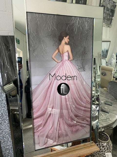 Lady in Pink Dress Picture on Mirror Frame with Glitter Detail