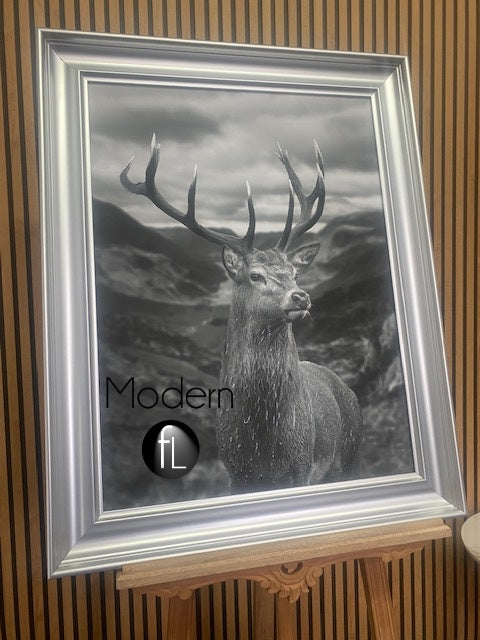 Highland Stag Portrait Black and White 76x96 Silver Curved Frame, Stag Picture