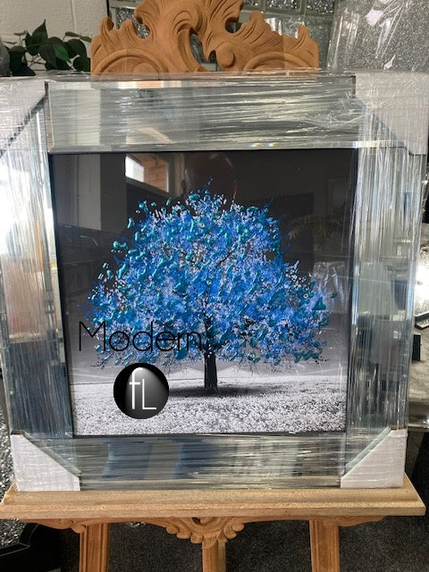 Small blue blossom tree picture in mirrored frame, blue glitter art picture