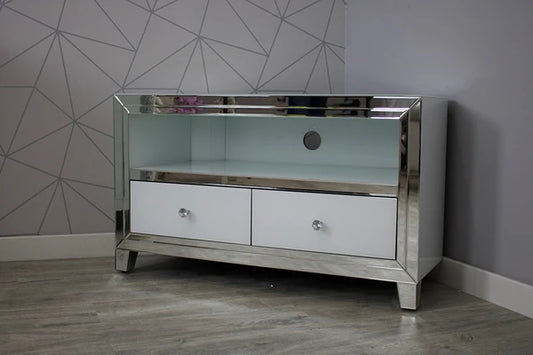 TV Stand White Glass TV Unit With Silver Mirror Trim 102 cm wide
