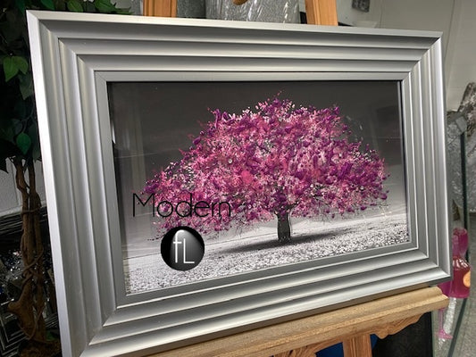 Stunning blossom tree 3D glitter art picture in silver matte frame 65x45 cm